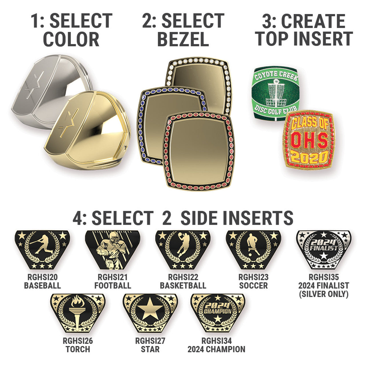 Our high quality championship rings Are the perfect award for your team or organization. Chose your color, outside bezels, side inserts and add your logo/info!
